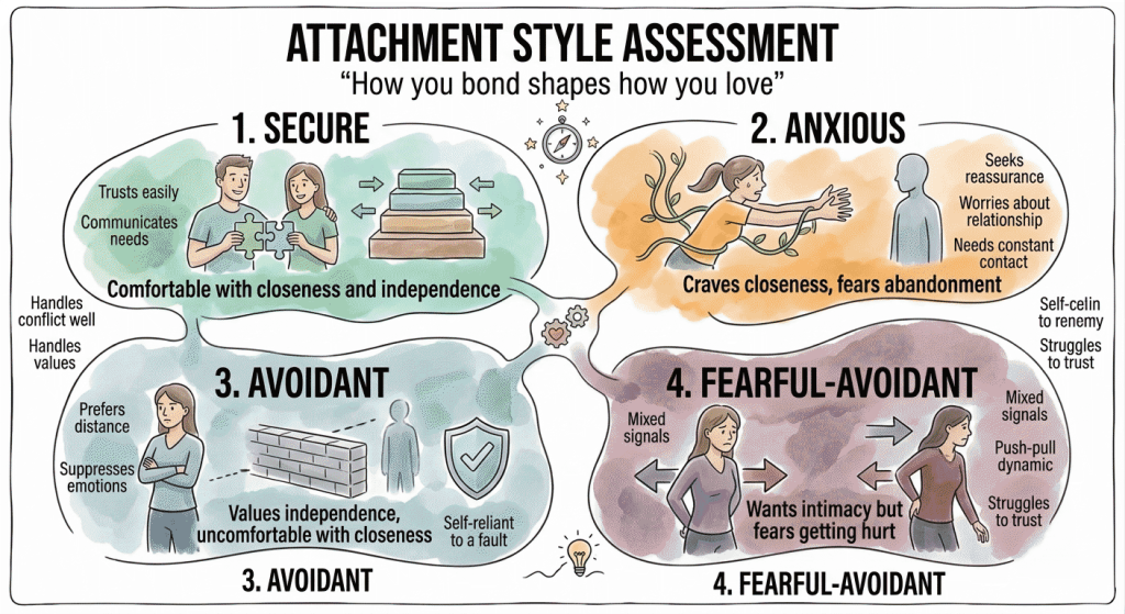 Secure, anxious, avoidant, or fearful-avoidant. Your childhood attachment pattern predicts adult relationship behaviors, conflict responses, and intimacy comfort levels.