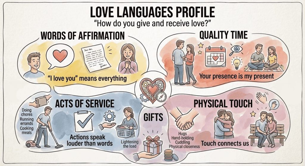 Words of affirmation, quality time, acts of service, physical touch, or gifts. Identifies how you give and receive love—and why you might feel unloved even when your partner is trying
