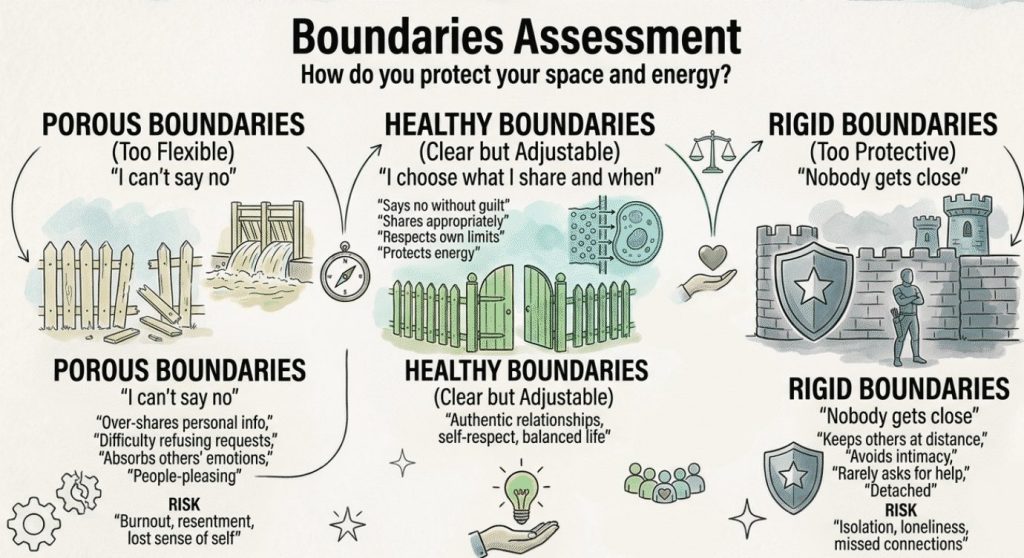 Porous (too flexible, people-pleasing), rigid (too protective, distancing), or healthy (clear but adjustable). Your boundary style affects every relationship dynamic.